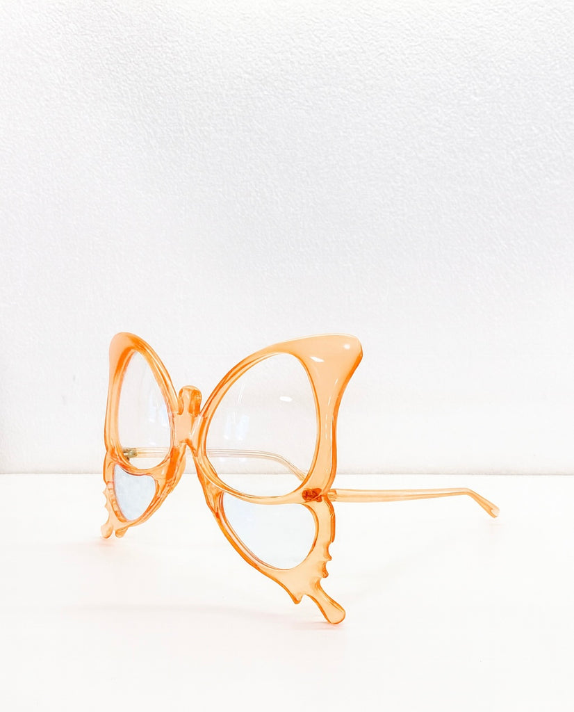 Handcrafted in England from premium Italian acetate, its sculptural butterfly silhouette embodies the playful experimentation of the 1970s era, where design met art and individuality ruled. The soft translucent peach tone radiates warmth and joy, while the exaggerated winged form adds a touch of fantasy and lightness.